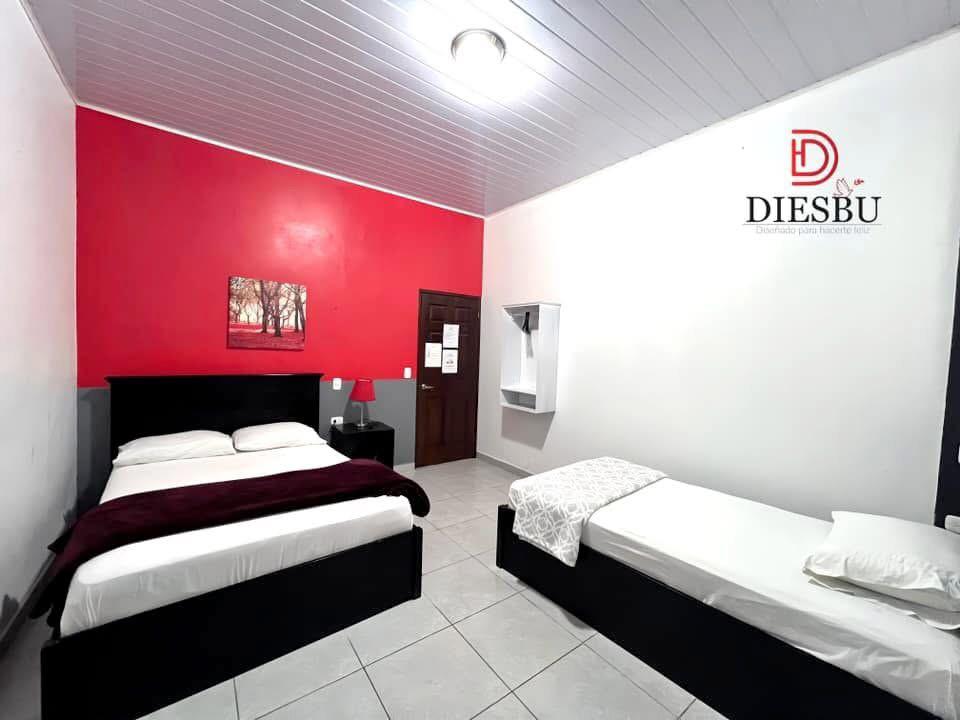 Amplia habitación provista de dos camas grandes, TV pantalla plana con cable, aire acondicionado, caja de seguridad y baño privado. Se puede incluir una nevera bajo pedido según disponibilidad.